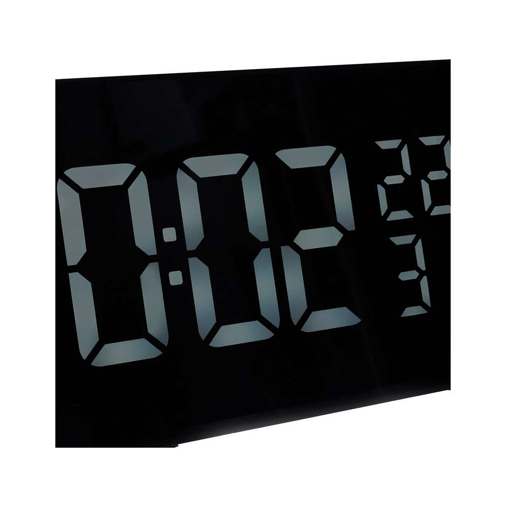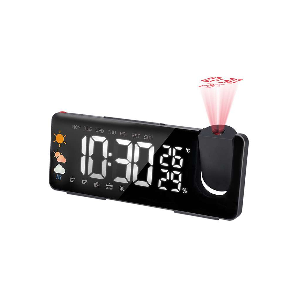 Cu un ecran LED clar și reglabil în intensitate, acest ceas afișează atât timpul în format 12 sau 24 de ore, cât și condițiile meteo curente, incluzând temperatura și umiditatea. Funcțiile duale ale ceasului deșteptător permit setarea independentă pentru zilele lucrătoare și weekend, iar tonul alarmelor poate fi setat să pornească radio-ul FM, pentru o trezire plăcută.