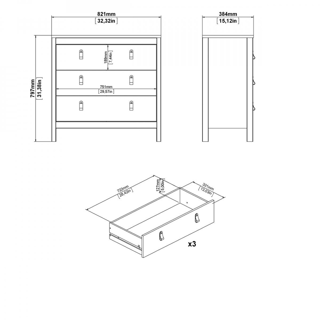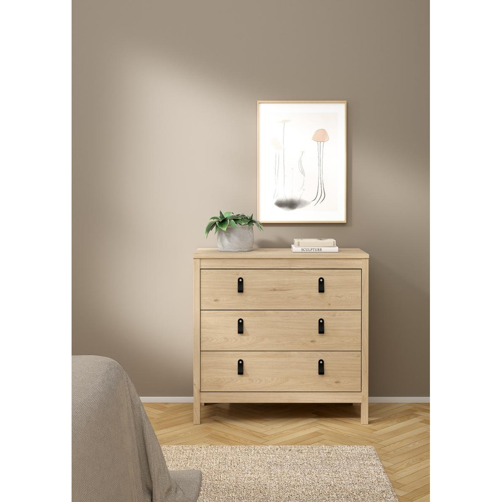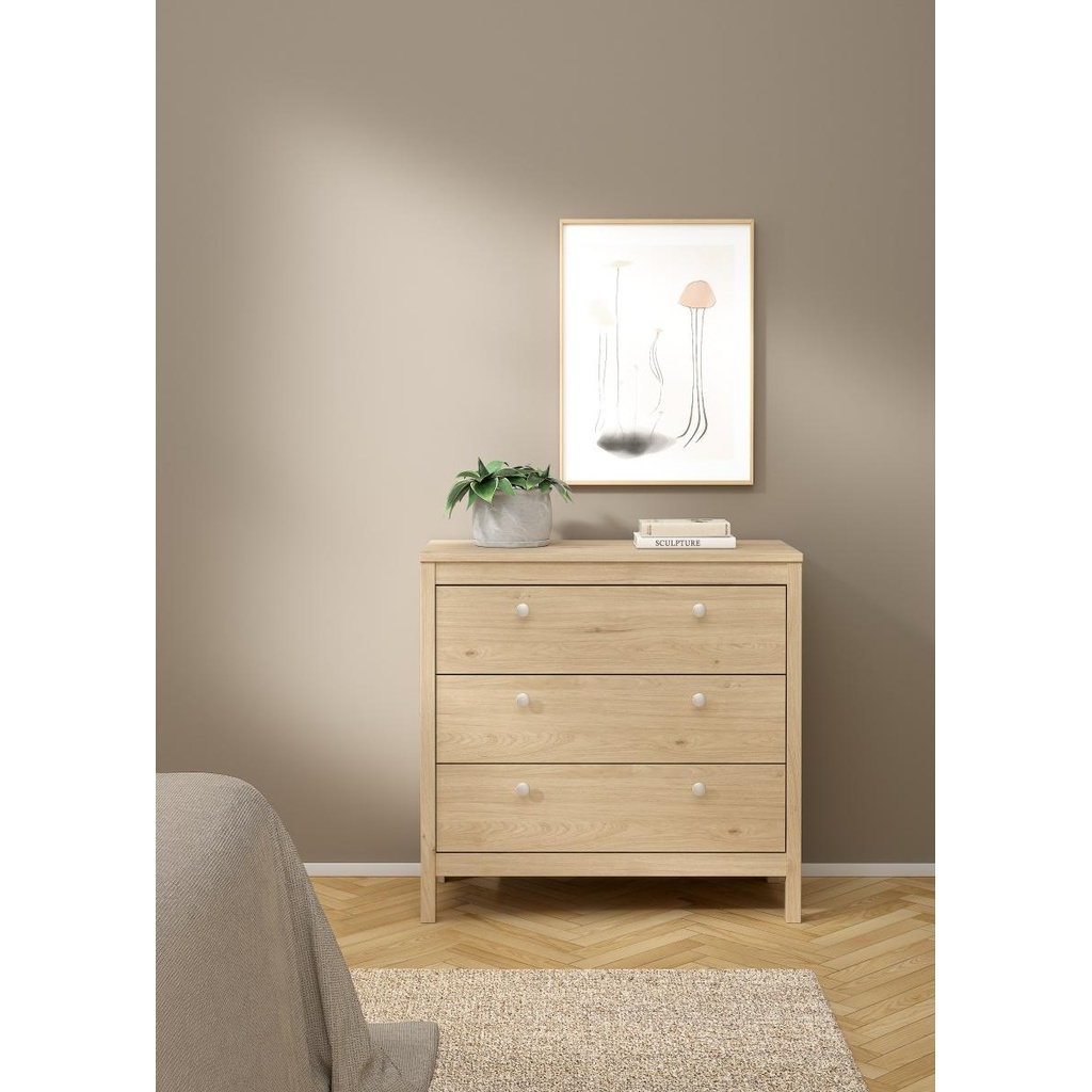 Designul său simplu și versatil permite integrarea cu ușurință într-o varietate de decoruri, de la stilul provensal până la cel scandinav sau clasic modern. Cele trei sertare generoase oferă spațiu suficient pentru organizarea hainelor, accesoriilor sau altor obiecte personale, menținând un aspect ordonat și aerisit în încăpere.