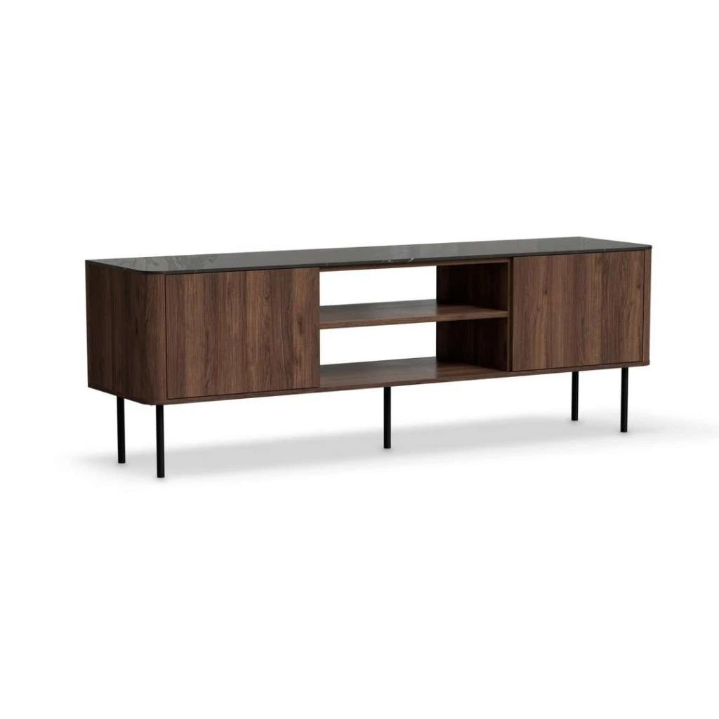 Dimensiunile generoase ale comodei, împreună cu spațiul eficient de depozitare, permit organizarea facilă a echipamentelor media și a accesoriilor. Blatul din lemn adaugă o notă caldă și naturală încăperii, în timp ce cadrul metalic conferă o rezistență îndelungată. Cu o greutate bine echilibrată de 30,5 kg, comoda este solidă, dar ușor de integrat.