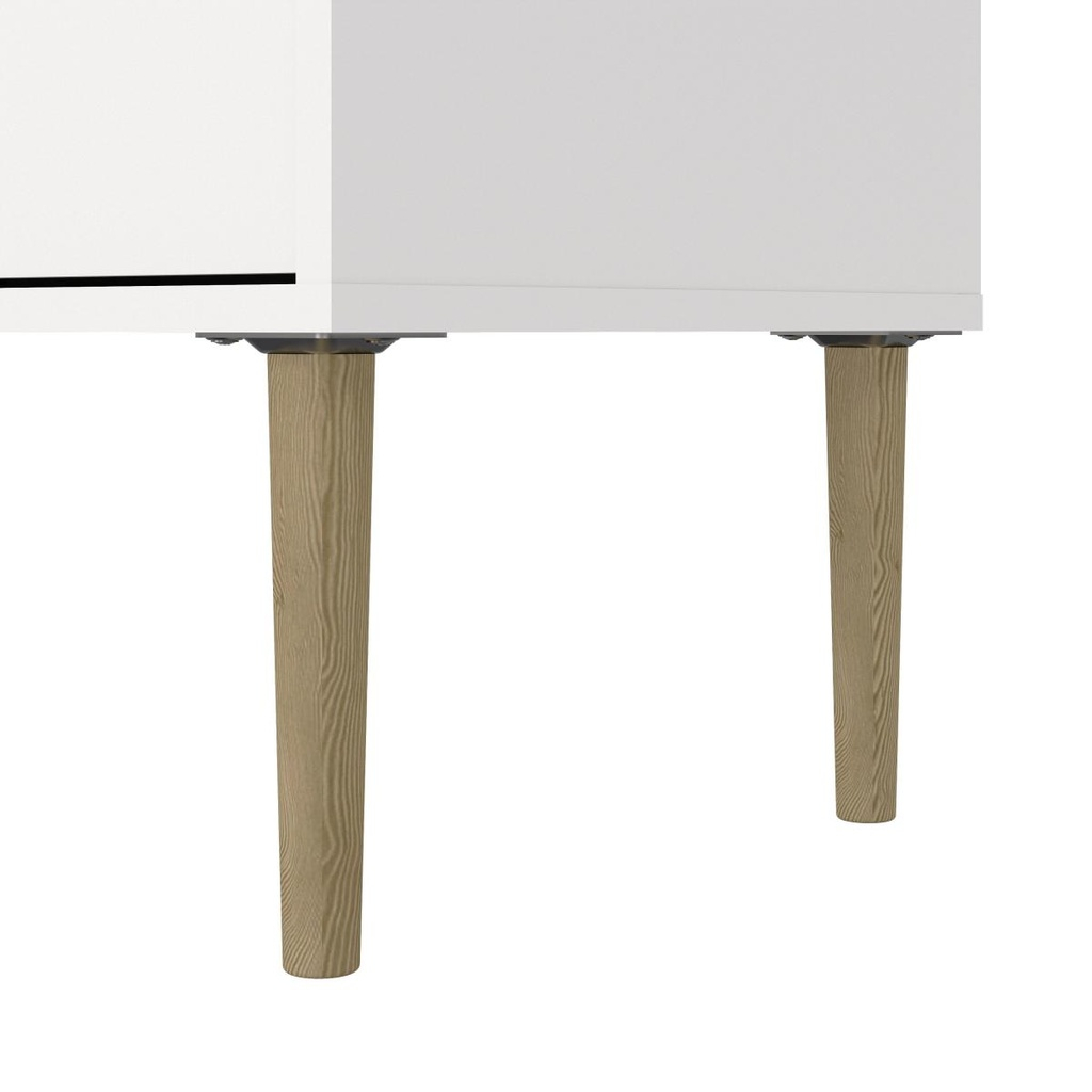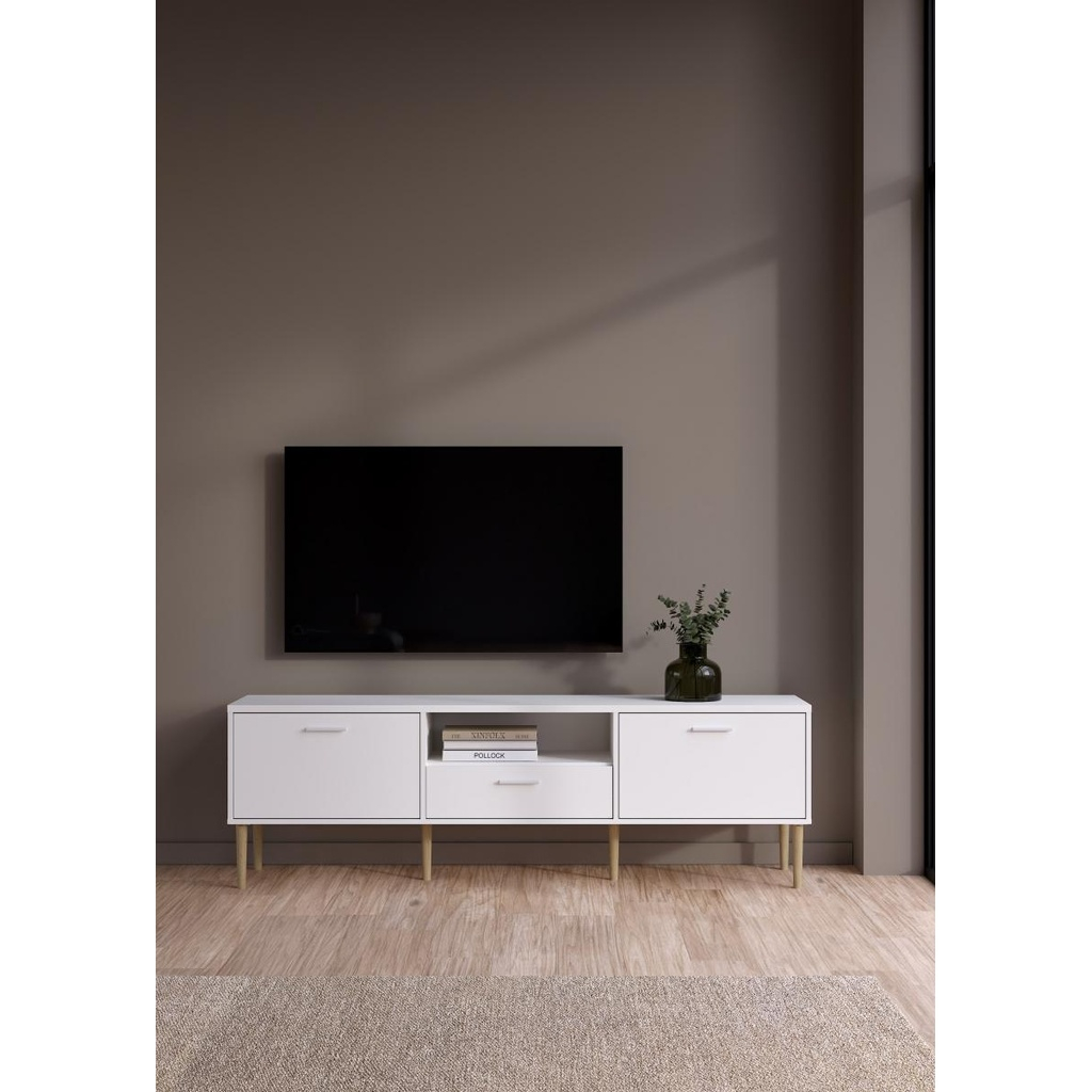 Comoda TV Mabela IV oferă un design modern și minimalist, perfect pentru un decor scandinav, care combină estetica cu funcționalitatea. Este ideală pentru a organiza și depozita echipamentele electronice și accesoriile într-un mod ordonat și accesibil.