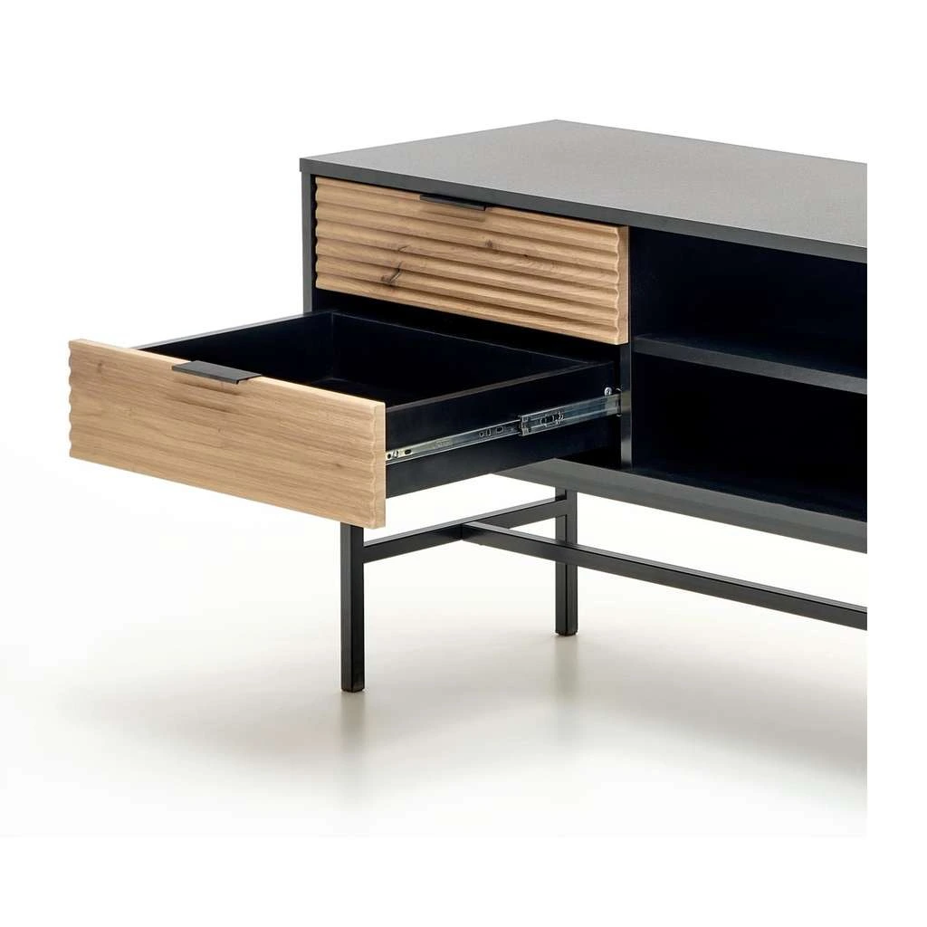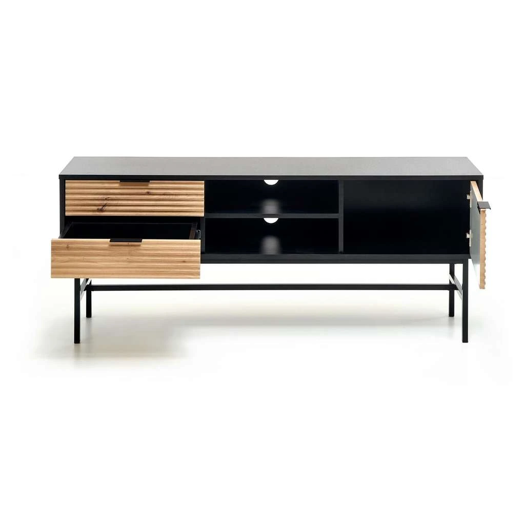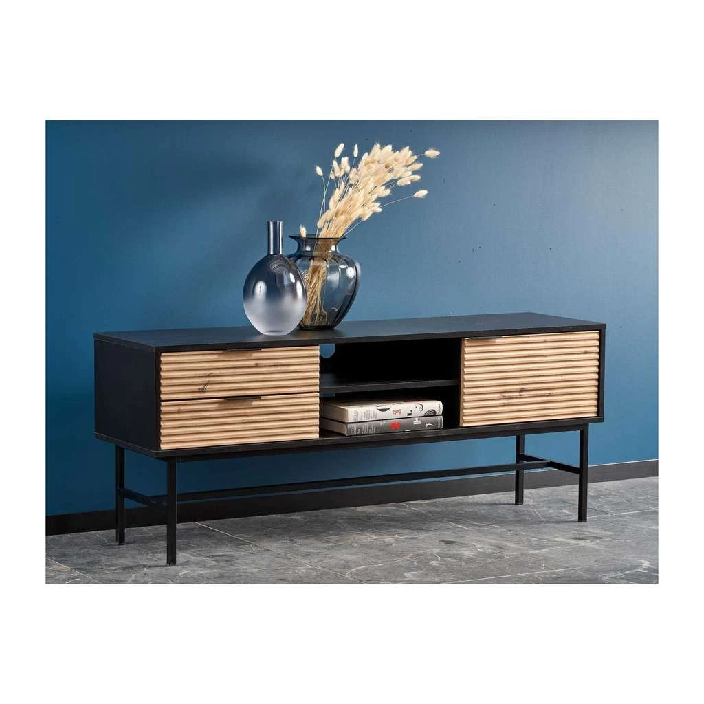 Datorită spațiilor generoase de depozitare, ai posibilitatea să organizezi și să păstrezi toate accesoriile media, cablurile și obiectele necesare într-un mod practic și eficient. Blatul din lemn adaugă un plus de eleganță și facilitează amplasarea televizorului sau a altor decorațiuni.