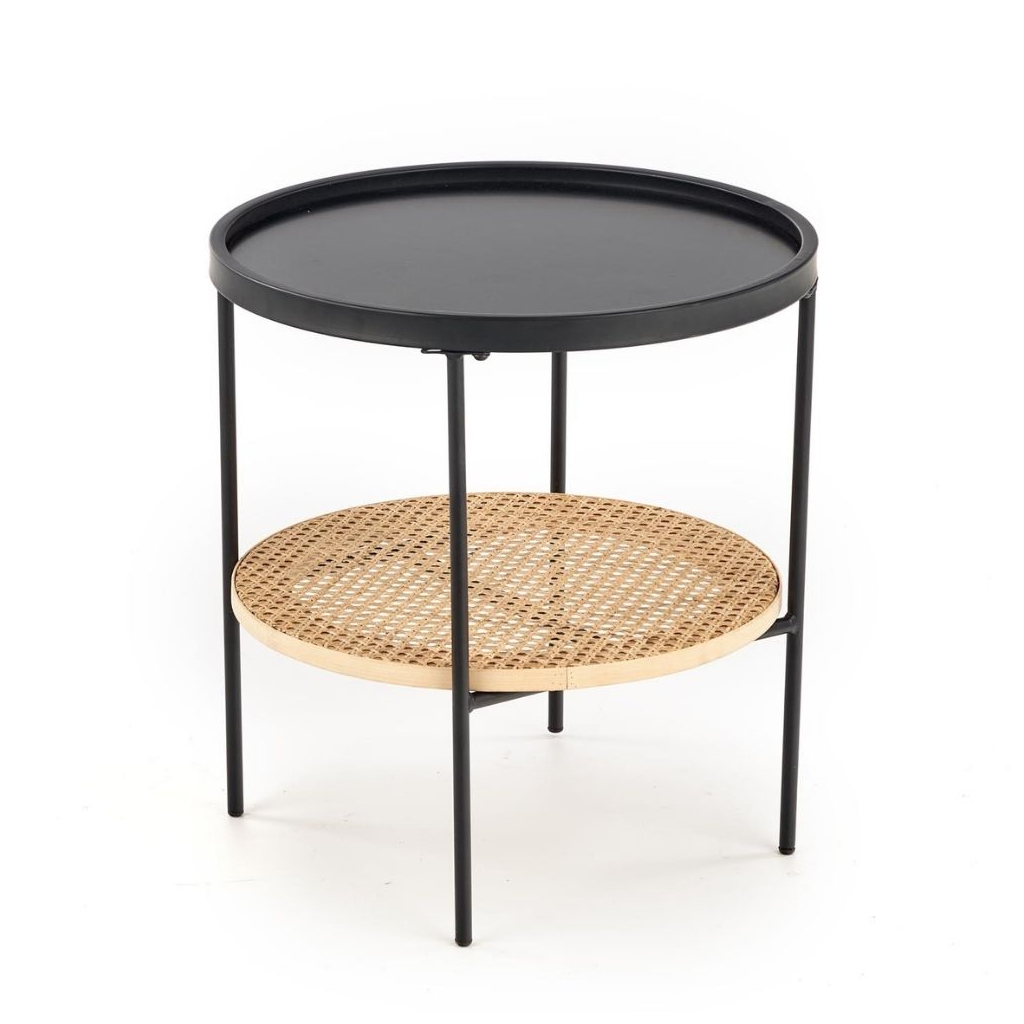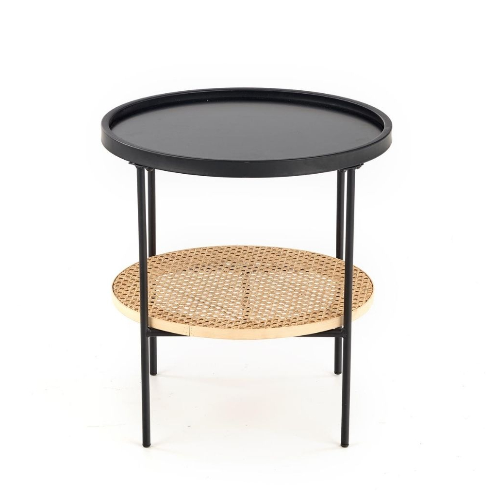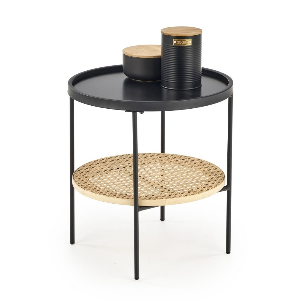 Blatul din lemn cu suprafață mată combină durabilitatea cu un aspect elegant, iar picioarele metalice îi conferă stabilitate și soliditate. Inserția din ratan adaugă un plus de textură și naturalețe, transformând masa într-un element de design atrăgător.