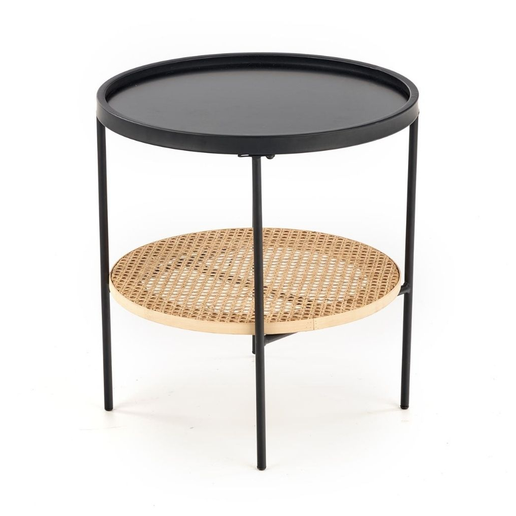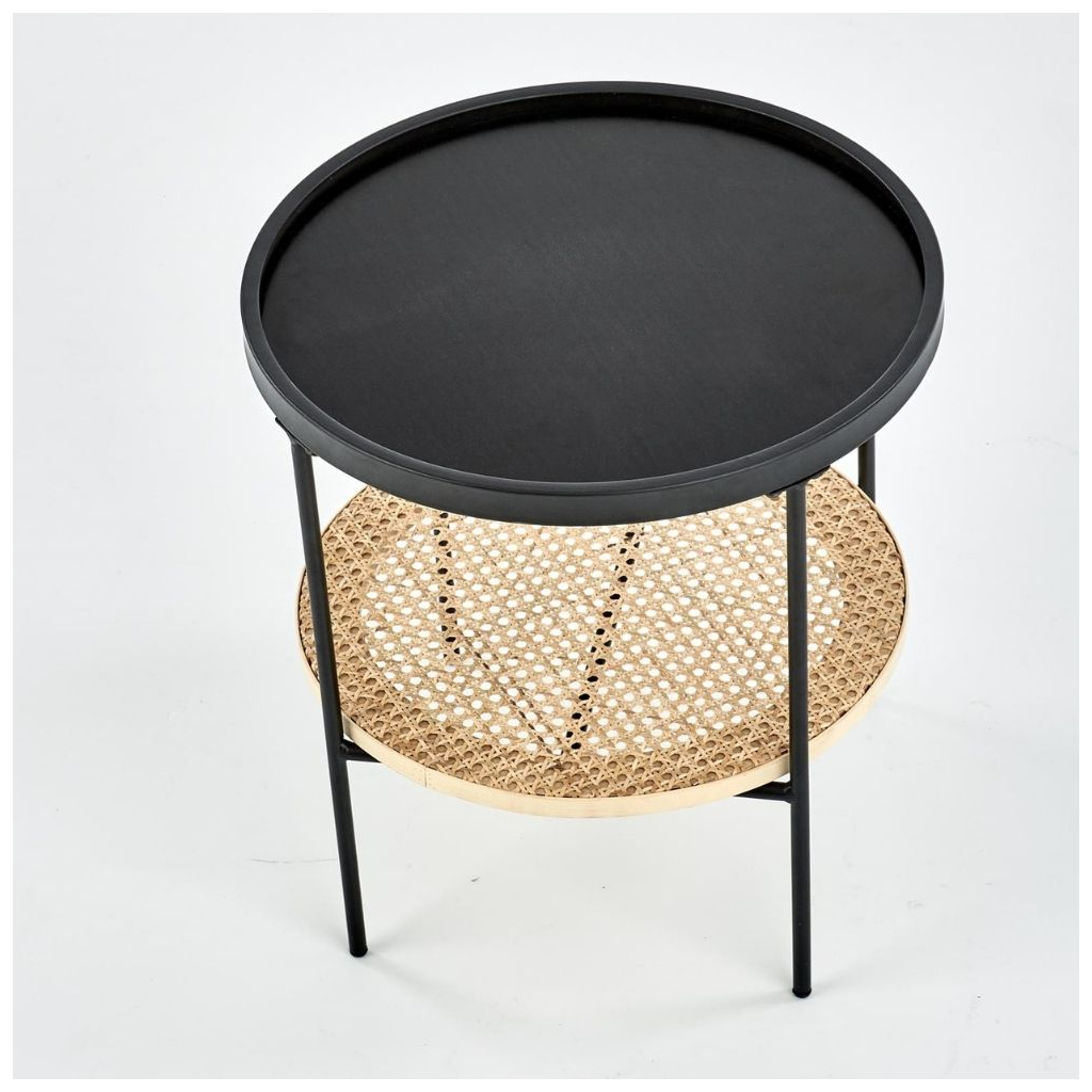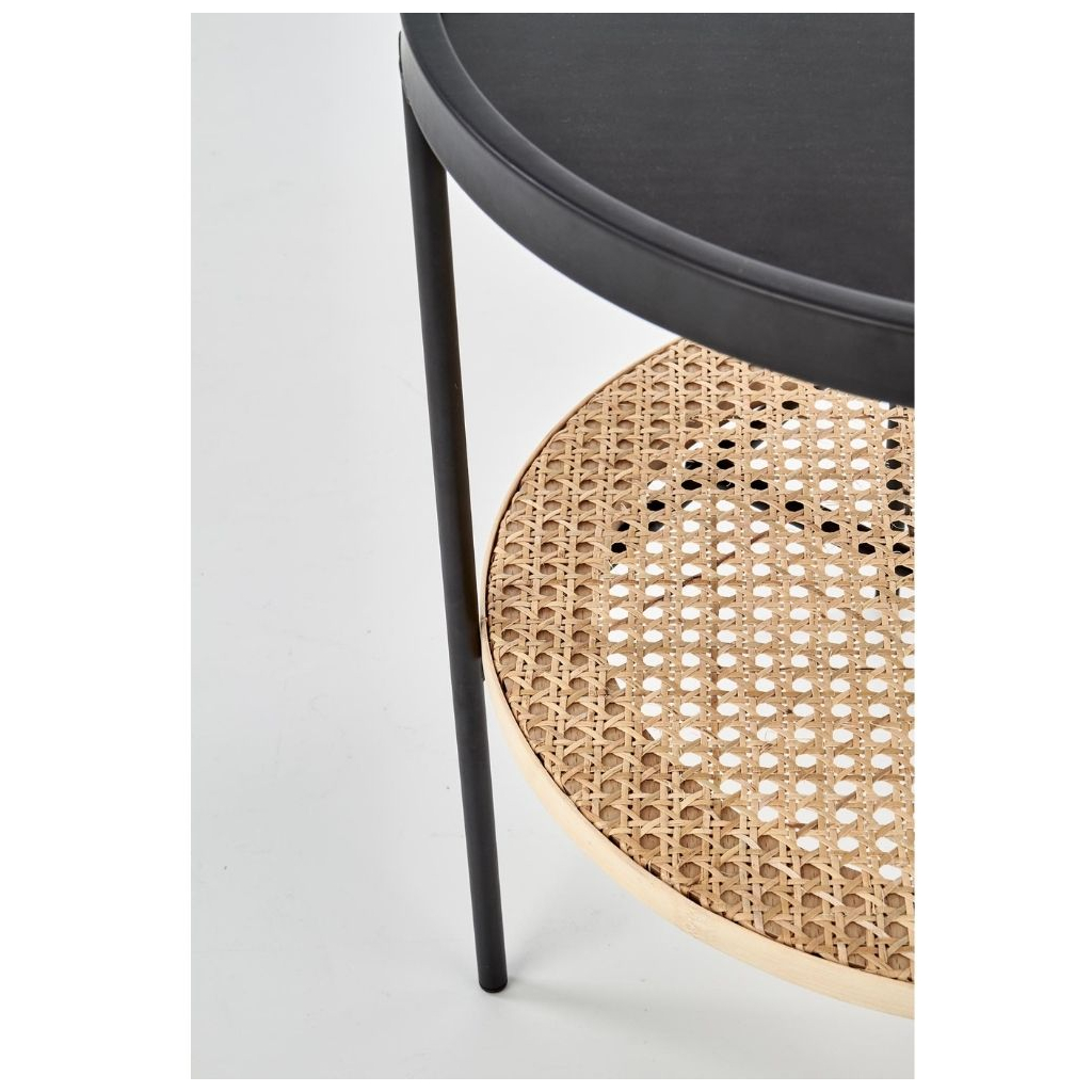 Blatul din lemn cu suprafață mată combină durabilitatea cu un aspect elegant, iar picioarele metalice îi conferă stabilitate și soliditate. Inserția din ratan adaugă un plus de textură și naturalețe, transformând masa într-un element de design atrăgător.