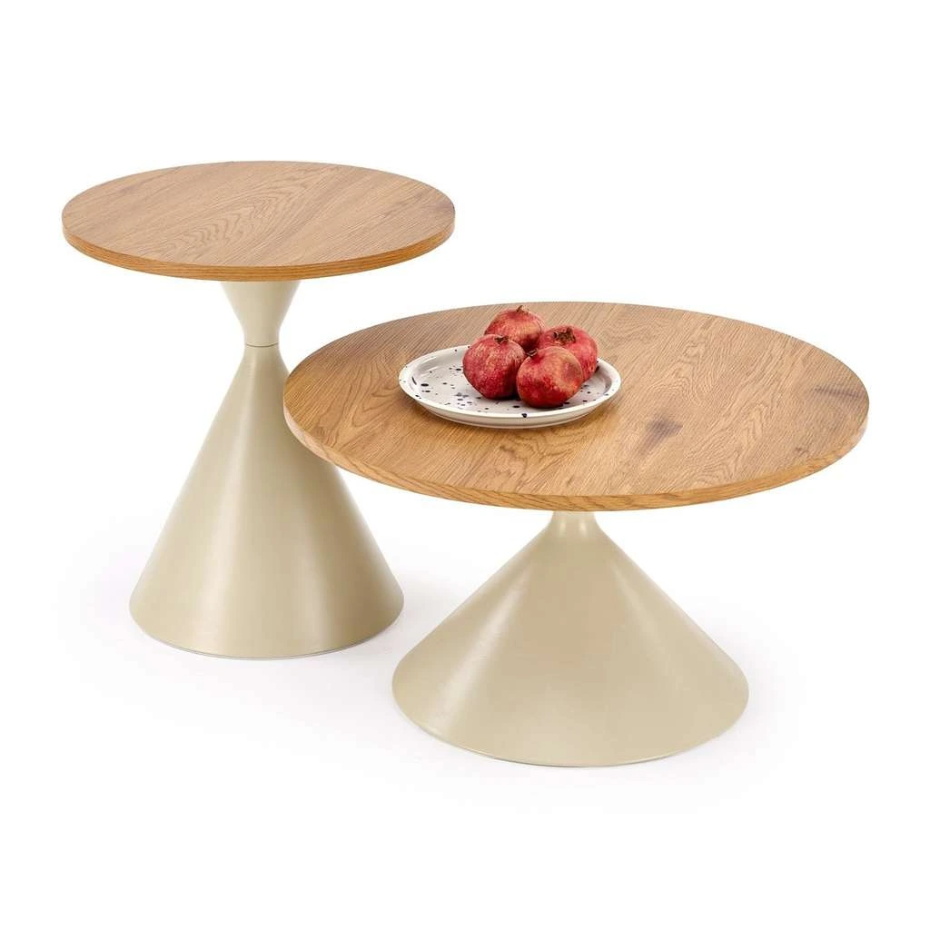 Măsuța de cafea Anilio adaugă un aer de eleganță modernă și minimalism în orice living sau spațiu de relaxare. Designul său inovator combină un blat rotund din lemn cu picioare metalice, oferind un echilibru perfect între robustete și stil. Setul include două piese cu dimensiuni și înălțimi diferite, ideale pentru a crea un aranjament practic și atractiv.