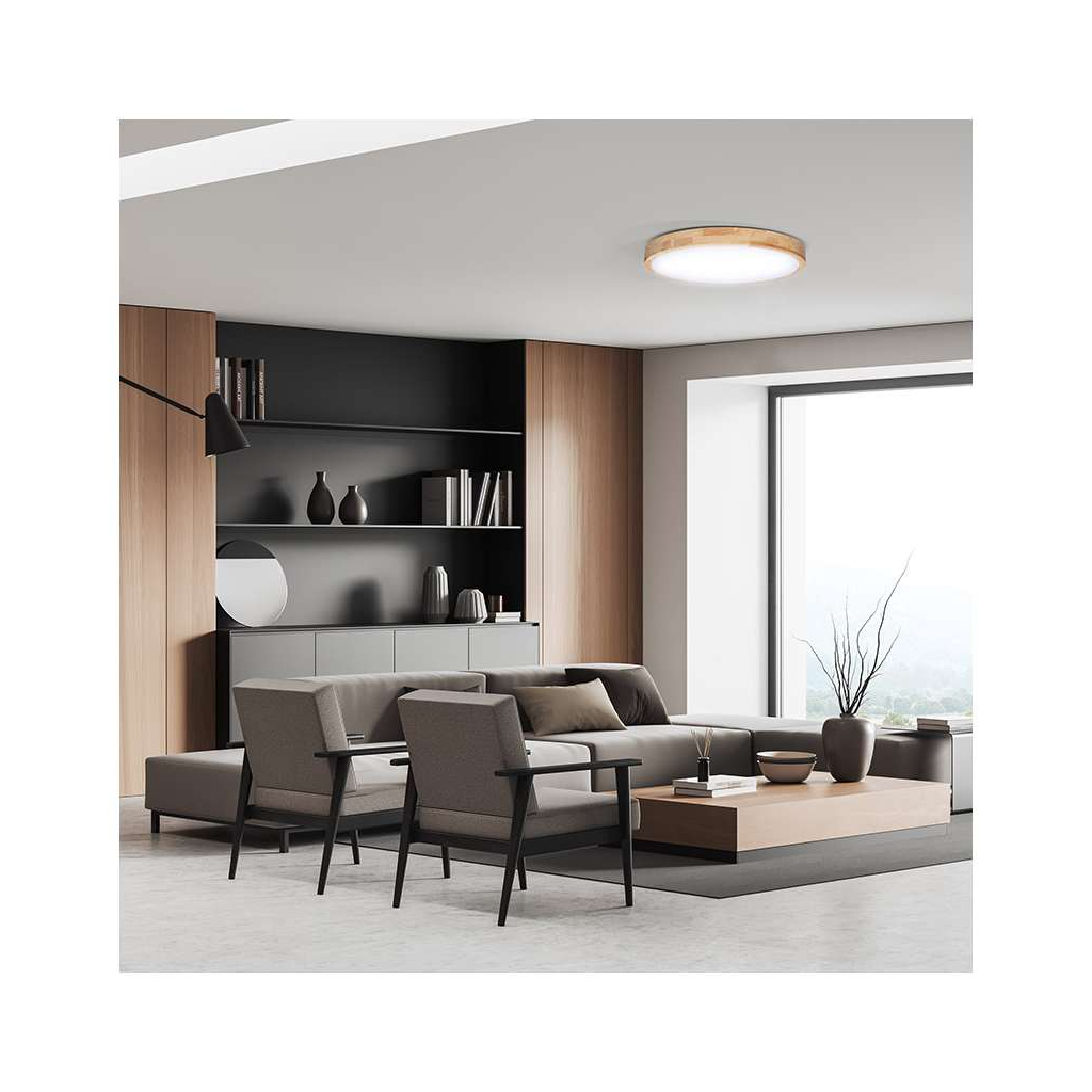 Plafoniera LED Solid Oak este soluția ideală pentru un iluminat modern și eficient al oricărui spațiu interior. Designul său echilibrat, cu materiale atent alese, oferă un aspect natural și elegant. Datorită telecomenzii incluse, poți regla cu ușurință intensitatea și temperatura culorii luminii, de la o lumină caldă la una rece, pentru a crea atmosfera perfectă în camera ta.