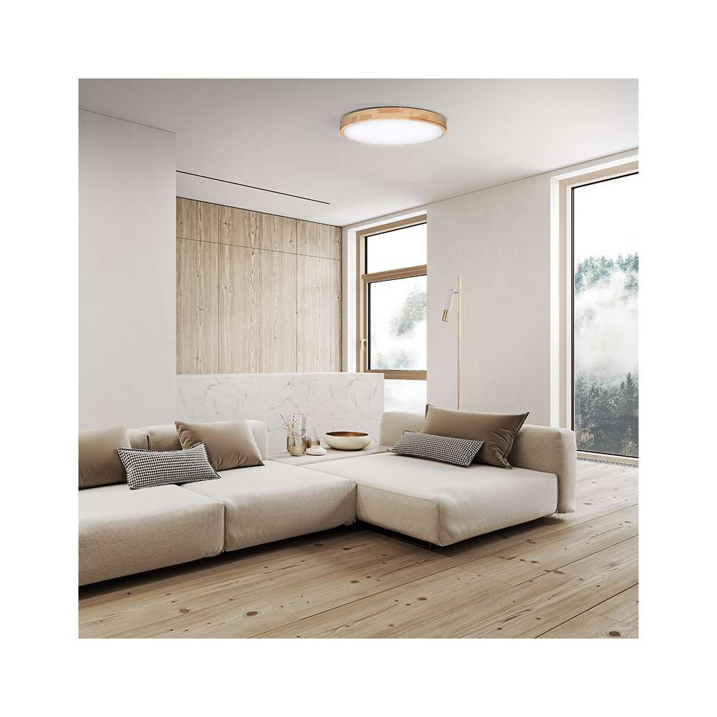 Realizată din lemn masiv de stejar, combinat cu elemente metalice și difuzor din PMMA, plafoniera adaugă un plus de eleganță oricărui interior. Profilul subțire și forma rotundă se integrează cu ușurință pe tavan sau pe perete, oferind o distribuție uniformă a luminii pe un unghi larg de iluminare.