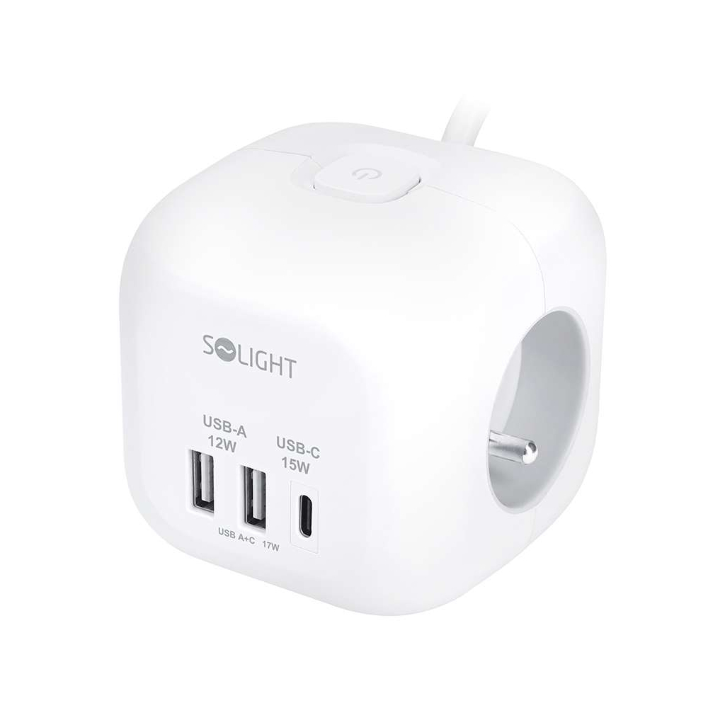 Prelungitor 3 prize + USB – cub, 2m, întrerupător, 3x1,0, alb