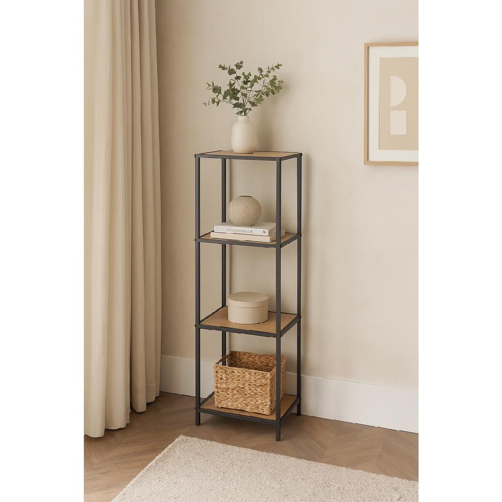 Raftul Moreno VI combină designul minimalist cu functionalitatea practică, fiind soluția ideală pentru organizarea spațiilor. Cele patru rafturi din lemn natural oferă un suport solid și estetic plăcut pentru cărți, decorațiuni sau alte obiecte mici. Suportul metalic asigură stabilitate și durabilitate, conferind totodată un aer modern industrial încăperii în care este amplasat.