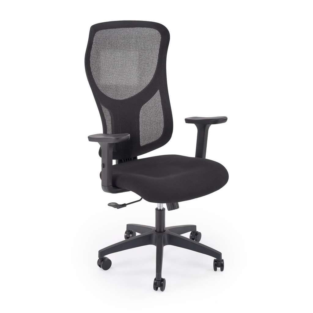 Tapițeria realizată dintr-o combinație practică de plasă și stofă asigură o ventilație eficientă și o senzație plăcută la atingere. Brațele reglabile permit personalizarea poziției pentru a reduce tensiunea la nivelul umerilor și brațelor, sporind confortul pe durata întregii zile de lucru.