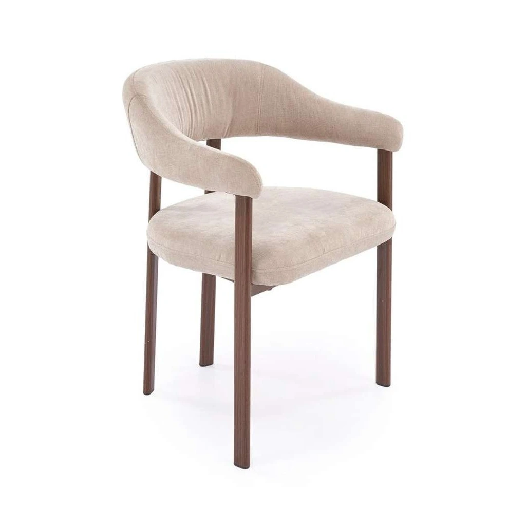 Baza metalică robustă oferă stabilitate, iar șezutul acoperit cu stofă aduce un plus de confort. Brațele fixe sunt concepute pentru a susține poziția corpului în timpul mesei, contribuind la o experiență plăcută și relaxantă. În plus, scaunul are o înălțime optimă pentru a se potrivi unei mese standard, asigurând o poziție corectă și naturală în timpul utilizării.