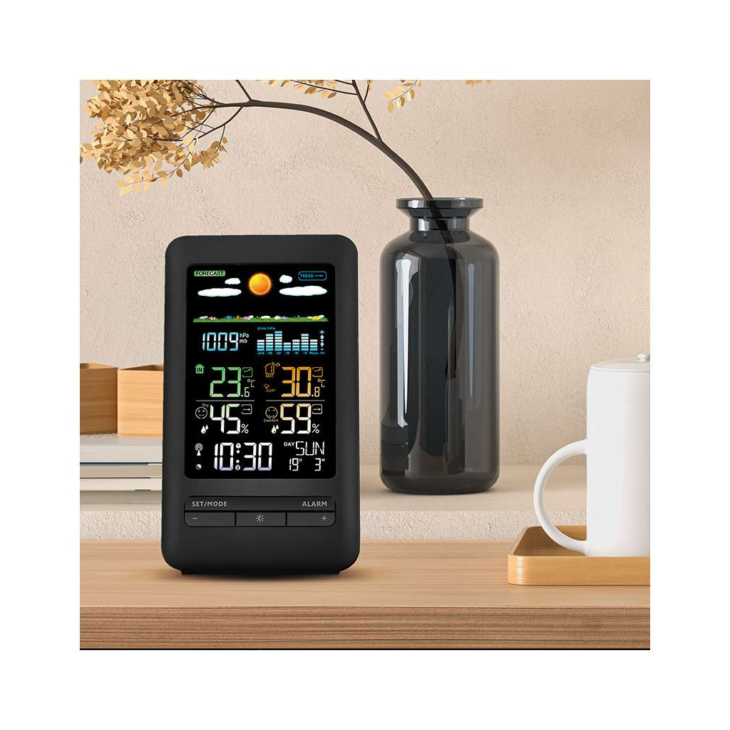 Dispozitivul vine însoțit de un senzor wireless exterior care transmite datele în timp real, până la 60 metri distanță, pentru o monitorizare confortabilă fără cabluri. Stația afișează și umiditatea, precum și presiunea barometrică, oferind o imagine detaliată a vremii și condițiilor ambientale. În plus, funcțiile suplimentare, precum calendarul și alarma, sporesc utilitatea acestei stații meteo.