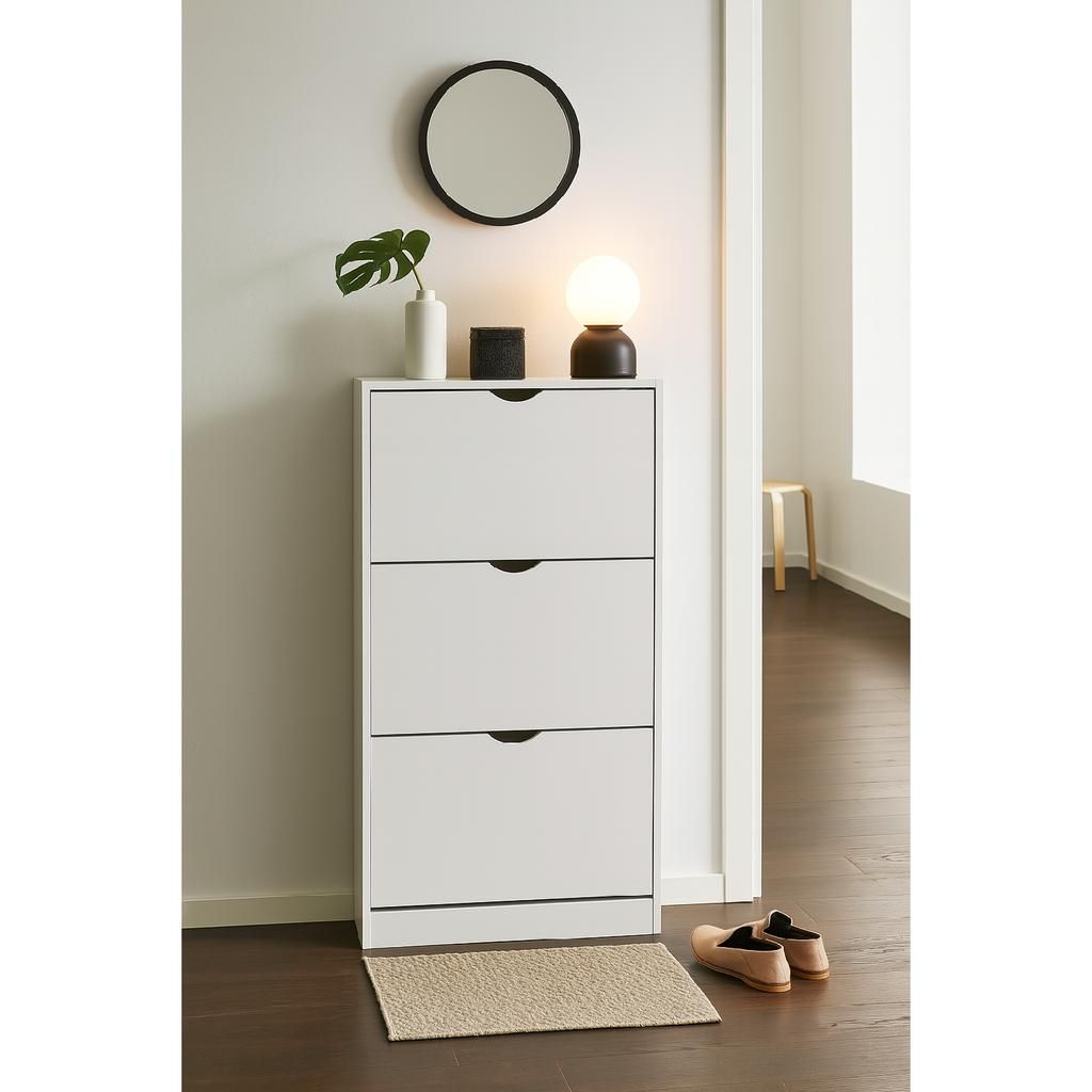 Fabricat din lemn rezistent, acest suport garantează stabilitate și durabilitate pentru utilizarea de zi cu zi. Cele trei compartimente înclinate oferă o organizare facilă a pantofilor, menținând ordinea și accesul rapid la încălțăminte. Deschiderea cu decupaje în loc de mânere asigură un aspect curat și simplificat.
